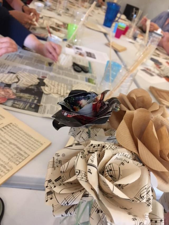 Twelve people spent two hours fiddling with sheet music and glue, with utmost patience, and created a little bunch of flowers to take home.
