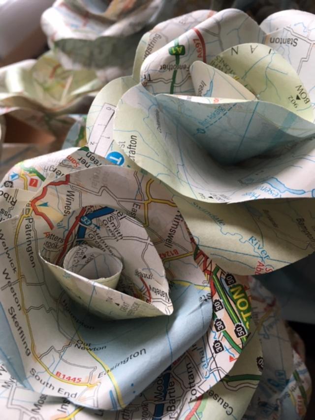 I have made paper roses out of vintage sheet music for years so when I saw an old road map that was going to be thrown out, I decided to make some regional roses and sell them by areas.