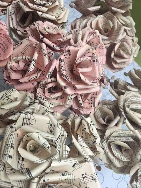 Half the order was made from vintage sheet music (mainly Mozart pianoforte pieces) and half using pages from the 1985 Mills and Boon classic ‘A Man Worth Knowing’ (subtitled ‘he defeated her evasive tactics at every turn…)