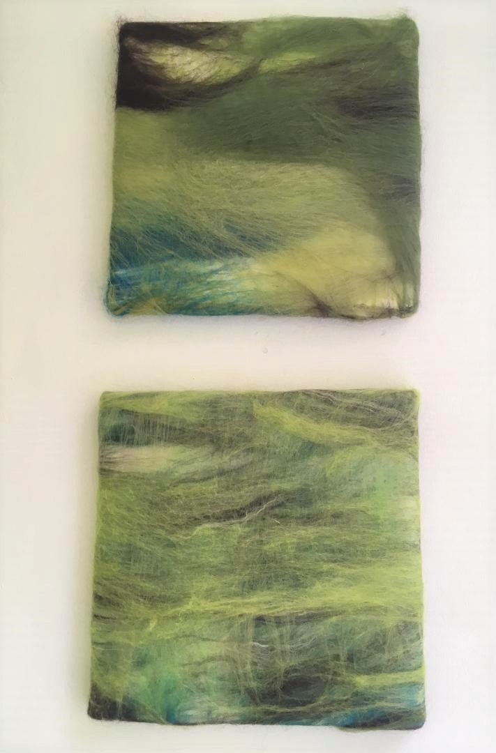 I have been making some felt squares in my favourite colours (addicted to green) on canvas and I think they are very effective on my white wall, next to my green wall.