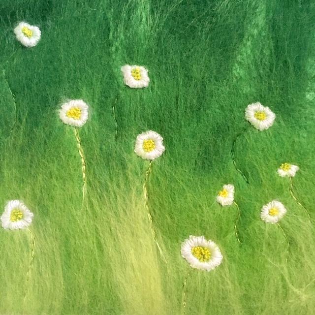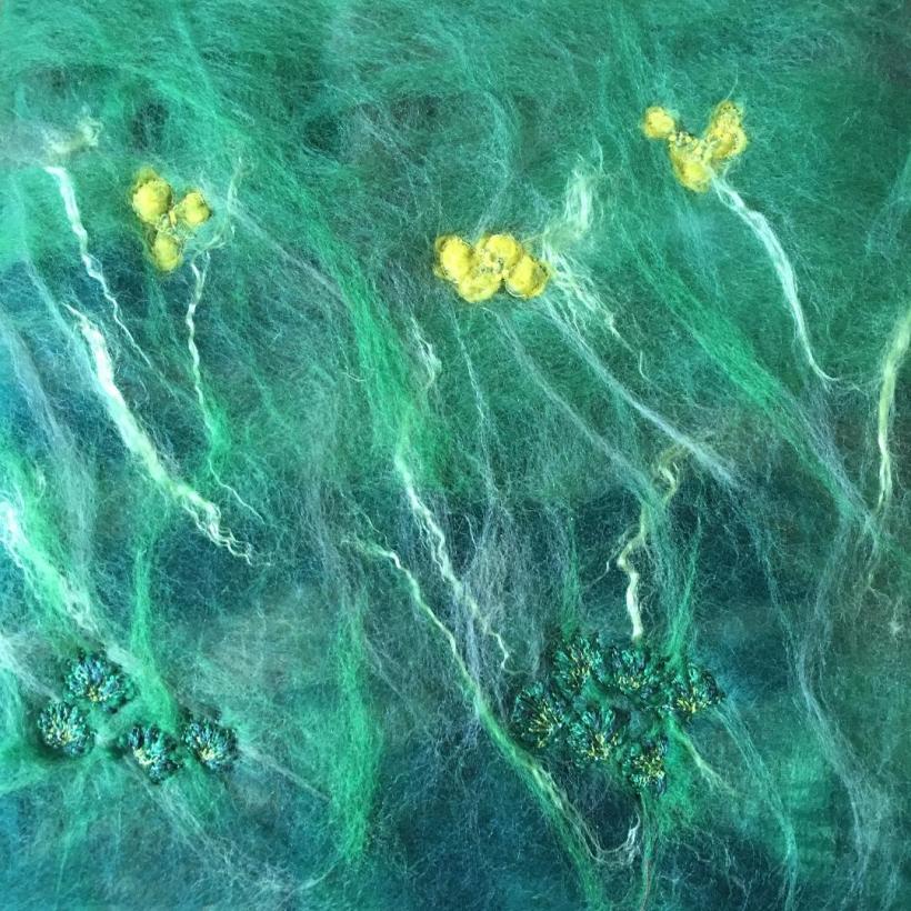 I have tried to convey the depth of colour and texture using several layers of soft felting in numerous shades of green and brown, machine embroidery for the leaf detail and hand embroidery with silk threads for the flower heads.