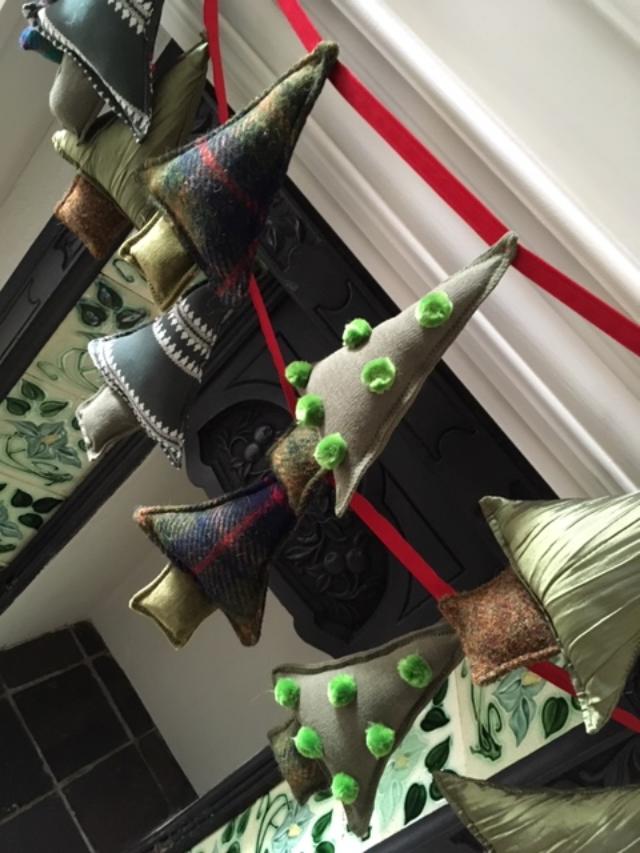 3D padded Christmas Tree bunting made with muted greens. red and brown fabrics – linen, harris tweed, velvet, crinkled, patterned and hand trimmed on folded red ribbon. Impeccable finish. Will last for years!